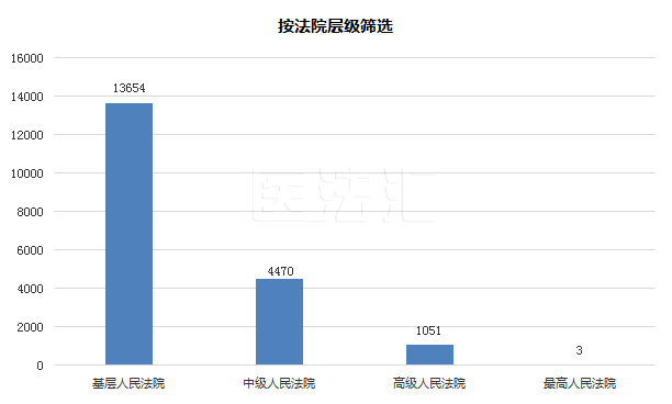 按法院层级划分,2019年基层人民法院审理医疗损害责任纠纷案件13654件,中级人民法院审理4470件,高级人民法院审理1051件,最高人民法院审理3件。法院层级与审判程序有一定的关联,因此医疗损害责任纠纷案件在法院层级上的数据分布情况与审判程序相差不大。