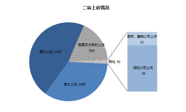 二审医疗损害责任纠纷案件中,患方上诉案件有1478件,医方上诉的案件有1085件,医患双方同时上诉的案件有564件,此外,还有少数医药公司、器械公司以及保险公司上诉的情况。