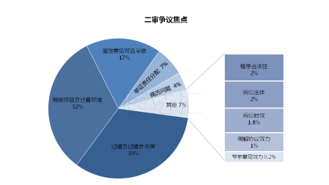 二审中的争议焦点依然集中体现在医方诊疗行为的过错及过错参与度、赔偿项目及计算标准、鉴定意见(含医疗事故鉴定)应否采信三个方面,与2018年相比,过错及过错参与度以1765件的微弱的优势超过了赔偿项目及计算标准1732件,占据争议焦点的首位,占比34%。从案例的具体内容分析,过错及过错参与度部分的争议焦点也涉及鉴定意见中过错参与度认定部分的争议,因此,鉴定意见在医疗损害责任纠纷案件中依然占据着非常重要的地位。