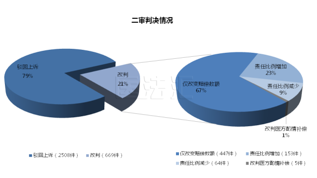 二审改判的案件有669件,其中67%的案件涉及具体的赔偿数额。值得注意的是,其中有153例医疗损害责任纠纷案件在二审程序中增加了医方的责任比例,占比23%,与2018年相比基本持平。