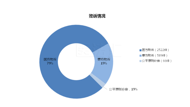 此处将“患方败诉”限定为一审法院驳回患方诉讼请求,患方上诉后二审法院驳回上诉、维持原判的情形。统计的3177件二审判决中,医方败诉2522件,占比79%,患方败诉589件,占比19%。与2017年医方败诉率为77%、患方败诉率为23%,2018年医方败诉率为78%、患方败诉率为21%相比,近三年医患双方的败诉率基本持平,但尽管数据差别不大,仍显示出轻微的医方败诉率上升、患方败诉率下降的趋势。另外,2019年二审法院判决医方给予患方适当补偿的案件有66件,占比2%,与往年相比也有轻微的增多。