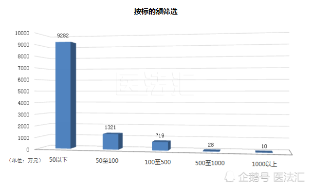 在我们检索的案例中,涉案标的额在50万元以下的有9282件,占比82%,涉案标的额在50万元至100万元区间内的案件有1321件,涉案标的额在100万元至500万元区间内的案件有719件,涉案标的额在500万元以上的案件仅有38件。