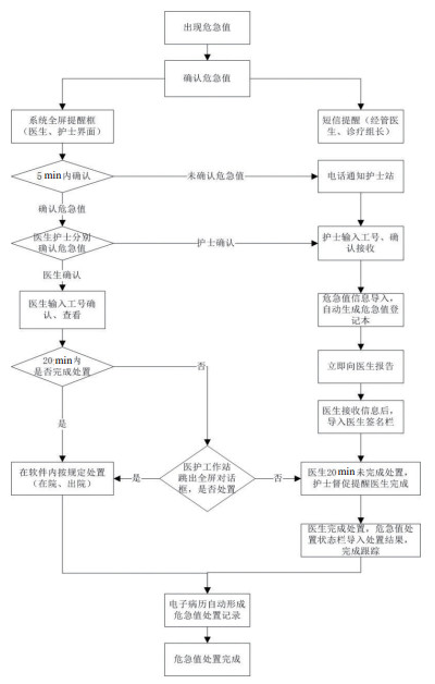 3 讨论 与传统危急值管理模式相比,基于信息化手段的临床危急值全程闭环管理模式,可以明显缩短危急值标本TAT,明显提高临床医护危急值确认处置及时率,但持续改善永无止境,目前危急值管理仍存在有待改善的方面:①危急值正确识别是后续管理措施的基础和保障[6],但非检验类危急值需要人工识别,仍存在一定的漏报和错报,需要进行自查和督查;②目前危急值管控流程到医生完成危急值处理结束,将来有望通过采集护士执行医嘱时间、复查后脱离危急值范围等时间点的监控,将危急值处置管控延伸到患者脱离生命危险;③对报告后医生判断为不必要立即处置频率高的危急值,应进一步与临床讨论,分析危急值项目或阈值设置合理性,以提升临床处置效率。 同时也要清晰地认识到,危急值管理不能仅仅依靠信息化系统,一方面要提升危急值管理意识,另一方面要依托信息化搜集的大量数据进行科学分析,减少无效危急值对医生的干扰,从而切实有效提升医院危急值管理水平。