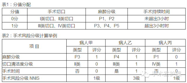 02手术部位标识手术部位标识是手术医师向患者和/或家属说明手术标识目的,并邀请患者和/或家属参与,核对患者身份、手术名称及手术部位等信息无误后,对手术部位体表所做的标识,不宜在体表进行标识的可做书面标识,以避免手术错误的发生。 03手术风险评估手术风险评估标准则是依据:(1)手术切口清洁程度,(2)麻醉分级,(3)手术持续时间这三个关键变量进行计算的。 手术风险分为四级。具体计算方法是将手术切口清洁程度、麻醉分级和手术持续时间的分值相加,总分0分为NNIS-0级,1分为NNIS- 1级、2分为NNIS -2级,3分为NNIS-3级。